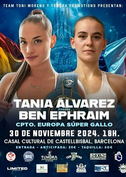 Tania Alvarez hará la primera defensa de su Campeonato de Europa del peso supergallo el 30 de noviembre en el Casal Cultural i Recreatiu de Castellbisbal, en Barcelona, ante la francesa Ben Ephraim (5-3-0, 0 KO).